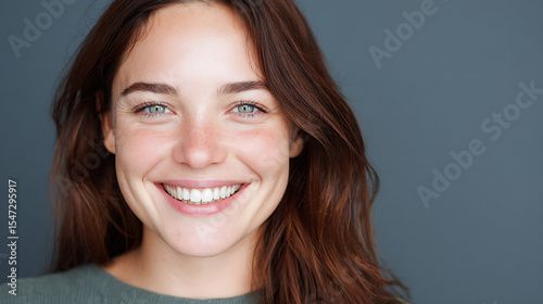 Close up portrait of a beautiful smiling 30 year old woman against a grey background Copy space available Banner Attractive face Gazing at the camera Light skin large eyes and long brown hair Europea