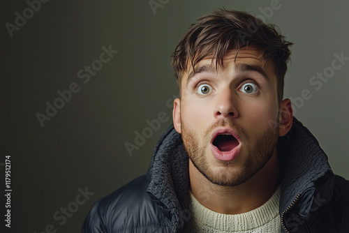 Close up portrait of a man looking surprised and screaming. shocked man open eyes and open mouth.