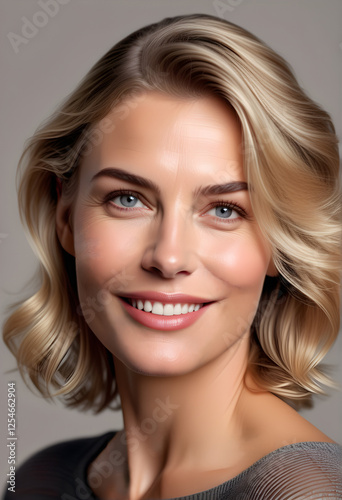 Close up portrait of a pretty smiling young woman with blond hair isolated on beige background. Clean and healthy skin, skincare. Health and wellness concept. Cosmetic and fashion concept.
