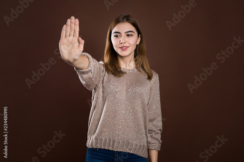 Close up portrait of a serious young woman showing stop gesture with hand isolated over brown background