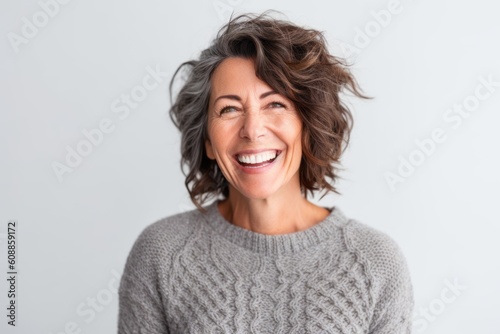 Close up portrait of a smiling middle aged woman isolated on a white background