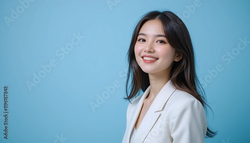 Close Up Portrait of a Young Woman in White Professional Suit with Radiant Smile and Warm Expression on Light Blue Background