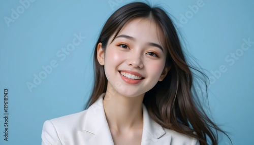 Close Up Portrait of a Young Woman in White Professional Suit with Radiant Smile and Warm Expression on Light Blue Background