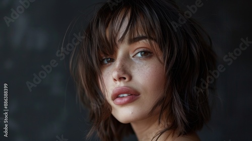Close Up Portrait of a Young Woman With Short Brown Hair and Bangs