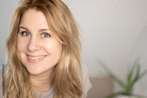 Close up portrait of an attractive young happy and smiling woman with blonde hair