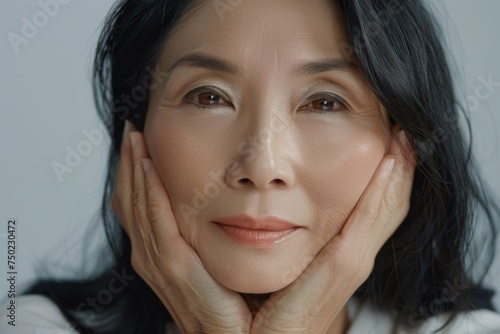 Close up portrait of Asian woman with flawless skin touching her face Promotion of cosmetology services