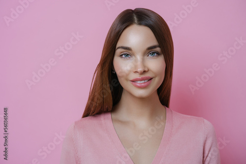 Close up portrait of attractive dark haired woman with brilliant smile, stands indoor against rosy background, has appealing look, isolated over pink background. Face model. Perfect fresh skin