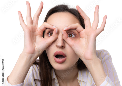 Close up portrait of attractive quirky young woman making binoculars with hands showing ok gesture on white studio background.