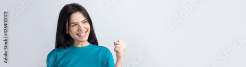 Close up portrait of attractive shouting in winning smiling with raised fists young she her girl wearing jeans shirt clothes isolated on grey background