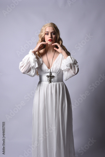 Close up portrait of beautiful blonde model wearing elegant white halloween gown, a historical fantasy character. Holding crucifix cross necklace, isolated on studio background.