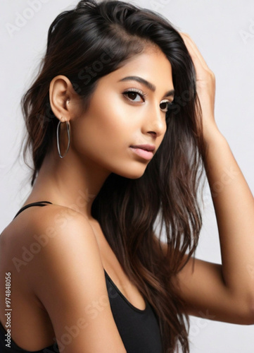 Close up portrait of beautiful Indian female model in 20s with perfect glowy skin