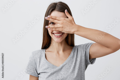 Close up portrait of beautiful joyful young caucasian student girl with dark long hair in trendy gray t shirt smiling with teeth, clothing eyes with hand, looking through finger with one eye.