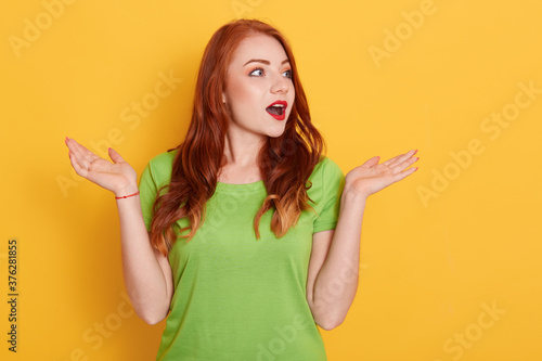 Close up portrait of beautiful red haired woman spreading hands and looking aside, standing isolated over yellow background, astonished female with widely opened mouth.