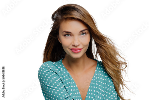 Close up portrait of beautiful young female has makeup, dressed in polkadot shirt, works as fashion model poses against white background, wears lipstick, has healthy smooth skin. Facial expressions