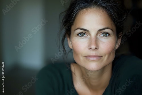 Close up portrait of confident middle aged woman with natural makeup and dark hair smiling at camera against dark background, wellness and beauty concept.