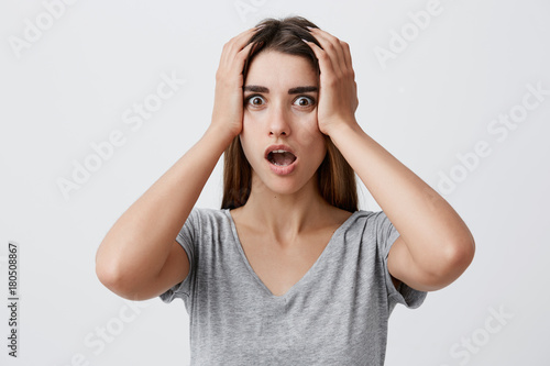 Close up portrait of handsome confused caucasian female student with long dark hair in gray t shirt holding hands on forehead, looking in camera with shocked expression. Woman forget to turn off iron