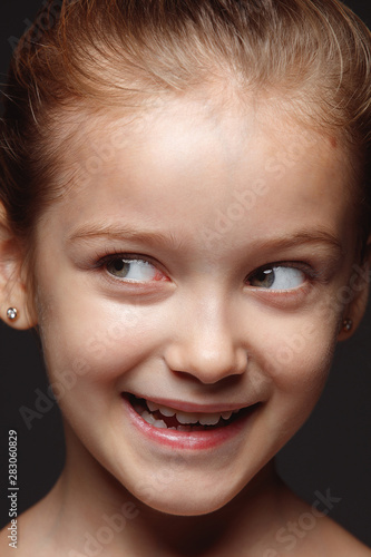 Close up portrait of little and emotional caucasian girl. Highly detail photoshot of female model with well-kept skin and bright facial expression. Concept of human emotions. Playful, looking at side.