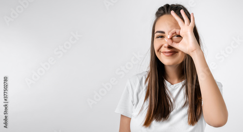 Close up portrait of modern girl looking at the camera through fingers in OKAY gesture. Copy space