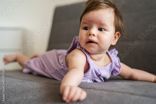 Close up portrait of small caucasian baby girl four months old lying on the bed couch sofa at home in summer day looking to the side copy space