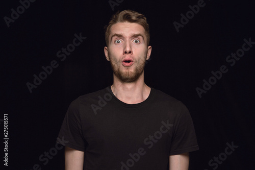 Close up portrait of young man isolated on black studio background. Photoshot of real emotions of male model. Wondering, exciting and astonished. Facial expression, human emotions concept.