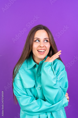 Close up portrait of young woman, cheerful isolated on purple studio background in blue windbreaker, vertical photo