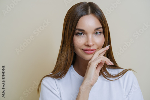 Close up shot of charming dark haired woman keeps hand on cheek, dressed in casual white t shirt, has minimal makeup, poses indoor isolated over beige background. People, beauty, wellness concept