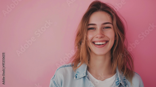 Close up shot of delighted beautiful friendly looking female with positive expression, has charming smile, rejoices meeting with friends, stands against pink background. People and emotions concept