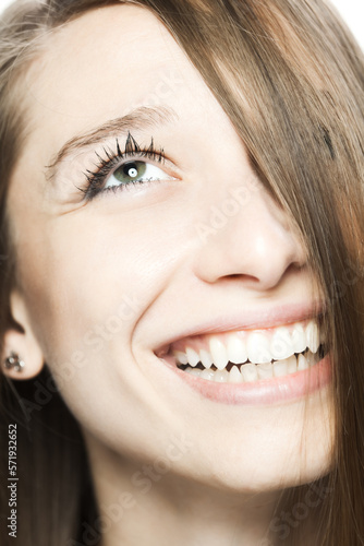 close up studio face portrait of a beautiful brunette girl with happy positive expression looking at camera...