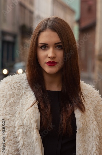 Close up trendy portrait of elegant young woman with big eyes and red lips