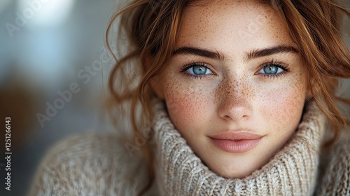 Close up, vertical portrait of a woman with freckles wearing a cozy sweater, looking serene and thoughtful.