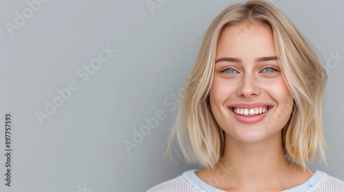 Close-up of a cheerful woman with beautiful blonde hair and a bright smile against a clean gray background, fashion, happy