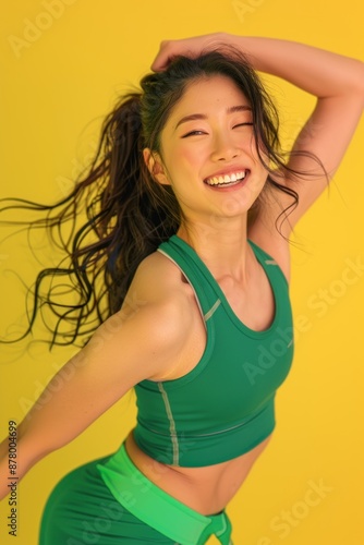 Close-up of a Japanese woman doing a side lunge and smiling, wearing a green workout outfit, standing in front of a yellow background, Portrait close-up, hyper-realistic, high detail, photorealistic,