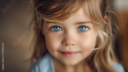 Close-up of a little charming girl with big clear innocent eyes who looks into the camera