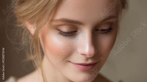 Close-up of a serene blonde woman with soft updo, wispy strands framing her face, closed eyes, long dark lashes, defined brows, glowing skin, subtle blush, natural pink lips,