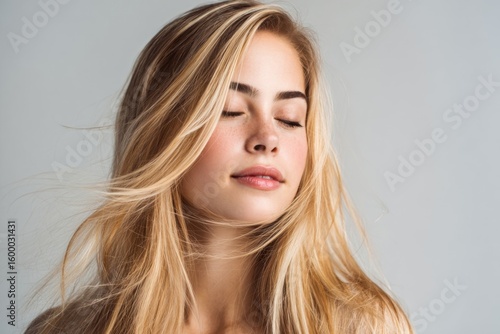Close-up of a serene young woman with long blonde hair and natural makeup.