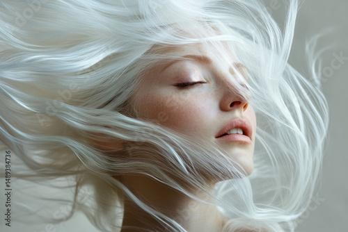 Close-up of a serene young woman with long white hair flowing softly around her face and closed eyes, conveying calm and peaceful emotion
