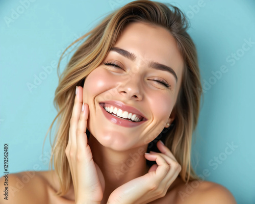 Close-Up of a Smiling Woman with Glowing, Radiant Skin, Soft Natural Lighting, Pastel Blue Background, Fresh and Minimalist Aesthetic, Beauty and Skincare Concept, Self-Care and Wellness Inspiration