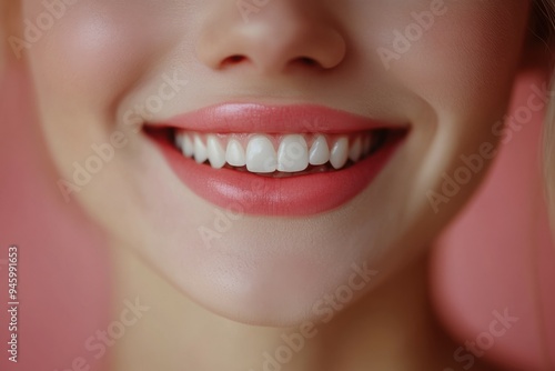 Close-up of a smiling woman's mouth against a blue background capturing her radiant expression and perfect teeth in bright daylight.