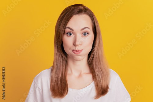 Close-up of a woman funny face puffed cheeks inflate blow air on yellow background