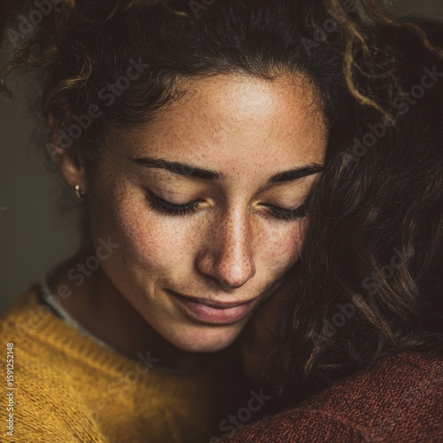 Close-up of a woman resting her head on another person's shoulder.