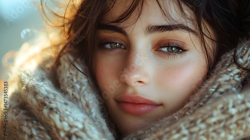 Close-up of a woman with a soft, warm scarf