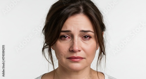 Closeup of a woman with red eyes tear tracks on her face and a worried expression