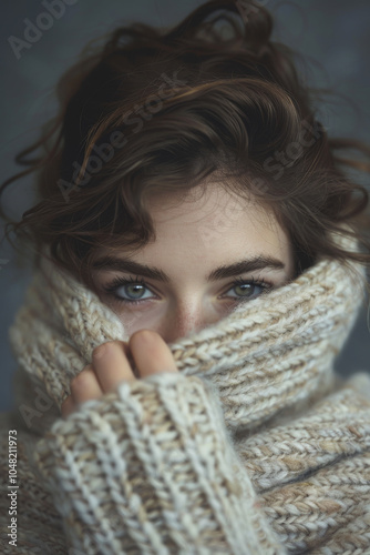 Close-up of a young woman in a cozy oversized sweater, peeking out with striking blue eyes, embracing a warm and intimate winter vibe.