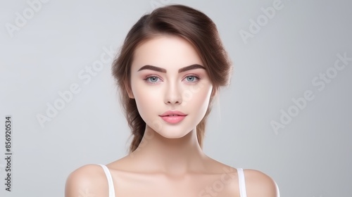Close-up of a young woman with clear skin and light makeup. She has neatly groomed eyebrows, soft pink lips, and light brown hair, against a neutral background
