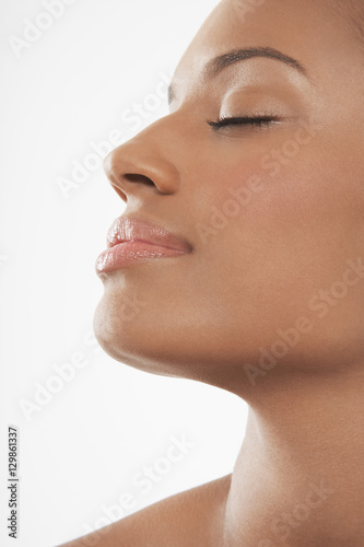 Closeup of beautiful young African American woman with eyes closed isolated on white background