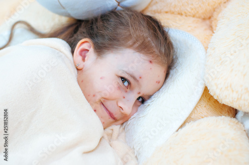 Closeup of cute funny little girl in the bed. Varicella virus or Chickenpox bubble rash on child