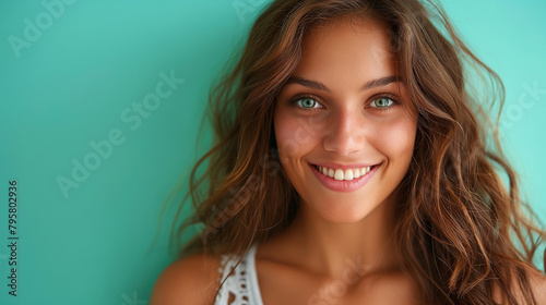 Close-up of fresh natural woman with nude makeup, white smile. Romantic girl with clean hydrated skin, well-nourished smooth face.