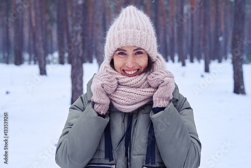 Close-up of gorgeous woman in knitted pink scarf and mittens pos
