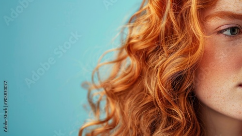 Close-up of red-haired woman's wavy hair against blue background