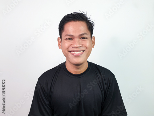 Closeup of Smiling Young Asian Man in Black Shirt Against White Background